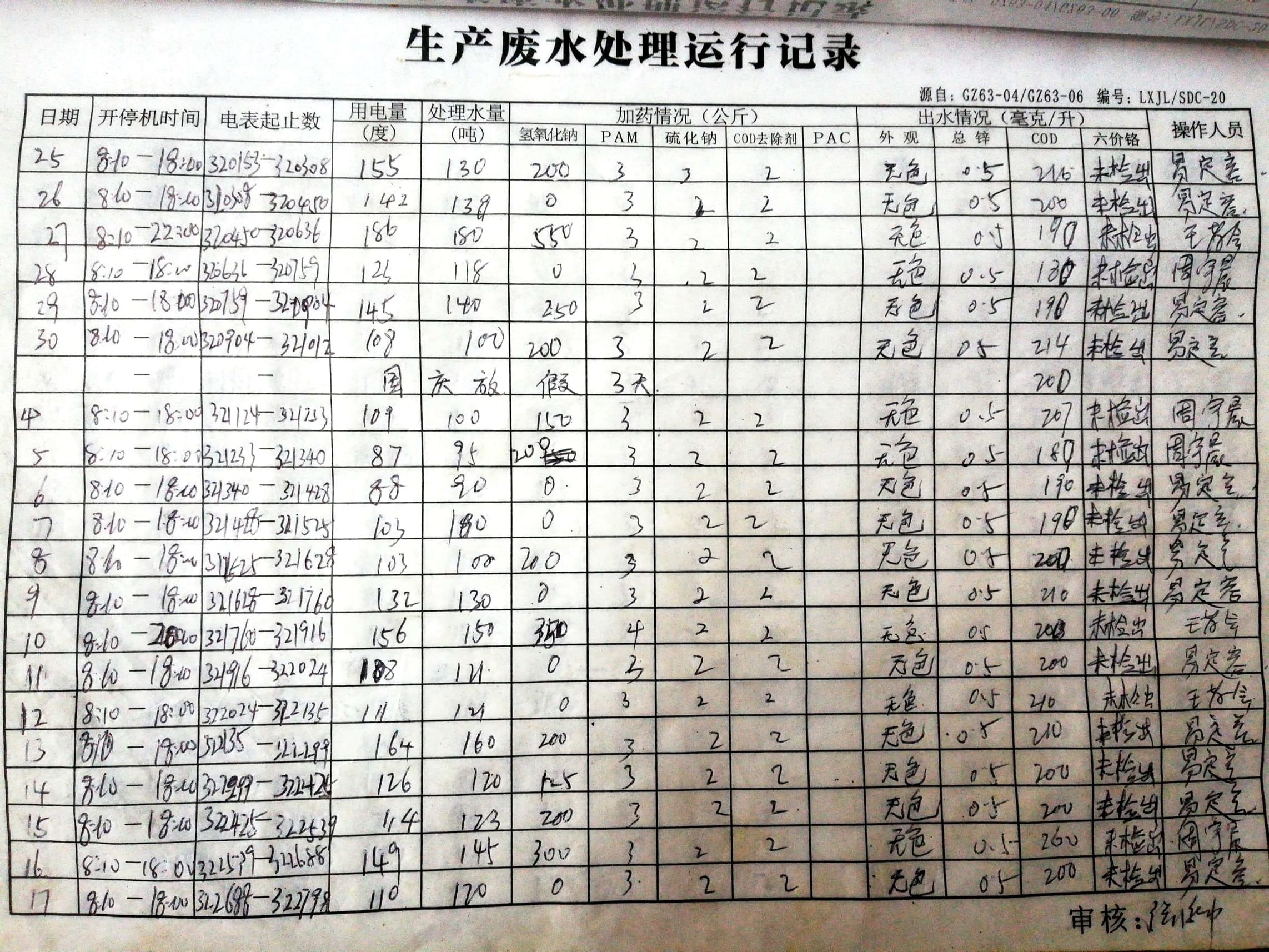 生产废水处理运行自行监测记录